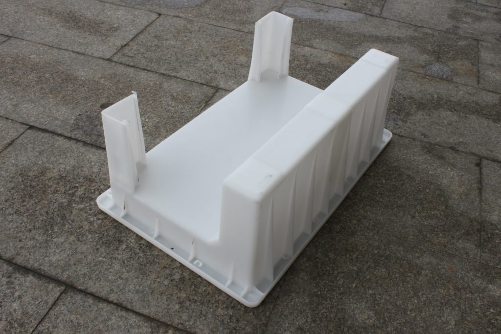 此款擋渣塊防撞型路牙石模具所用原料為聚丙烯樹脂,經(jīng)注塑機高溫熔解后在鋼模具內(nèi)成型完成。乍一看似乎樣子有點奇怪,其實所澆筑水泥防撞路牙石呈L型,模具底部的兩個腳為支撐柱,方便實際擋渣塊、擋土塊的澆筑過程。為保障防撞路牙石模具的使用耐久性,更是在受力兩面增加了十六條加強筋,有效提升重復(fù)使用次數(shù),節(jié)儉生產(chǎn)成本。