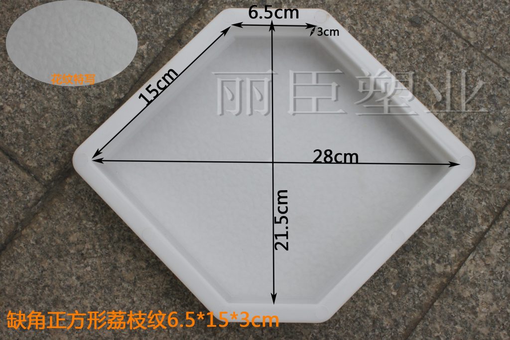 此產品專供西安客戶的一款彩磚模具,主要結構以正方形缺角形狀設計,其中底部為荔枝紋圖案,即所預制水泥彩磚成品表面為防滑荔枝紋圖案。此西安彩磚模具對角對稱長度為28CM,缺角對稱長度為21.5CM,詳細見下圖。