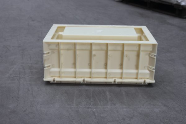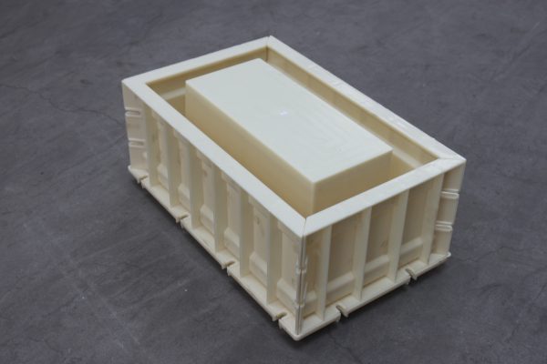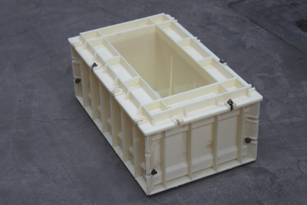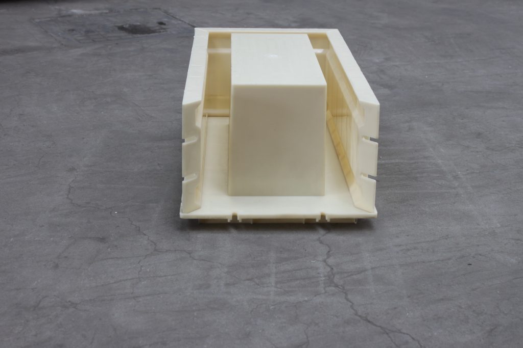ABS材質(zhì)的空心磚塑料模具,整體呈長方形樣式,總共分為三個部分,空心磚塑料模具底座、側(cè)面短板及側(cè)面長板,在長板與短板鏈接處均采用橢圓凹槽,用于鐵質(zhì)螺絲螺帽拆卸裝配。鑒于塑料模具自身尺寸較大,為了使得空心磚塑料模具施工更為耐用牢固,在每一個配件背部分別采用十字加強筋設(shè)計,以確保正常施工。