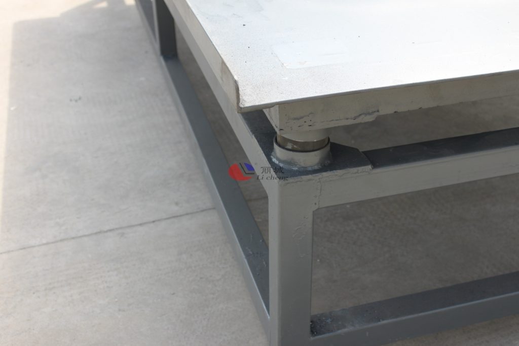 對于尺寸規格較大的水泥制品模具,在澆筑過程中不方便將模具內的空氣,以及混凝土在模具中的均勻攤平,通過使用振動臺來將內部空氣排放和混凝土的振實。振動臺四個臺腳處都設計上了墊腳,在震動過程中能保持平衡。
