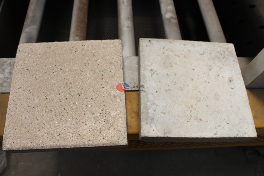 1.先使用塑料模具來澆筑成型的混凝土彩磚,對于預(yù)制成型的混凝土彩磚進行模具的脫模,放置一旁得以備用,下面這張圖是主要能更清楚的看出使用混凝土路面拋丸機后的水泥磚表面。