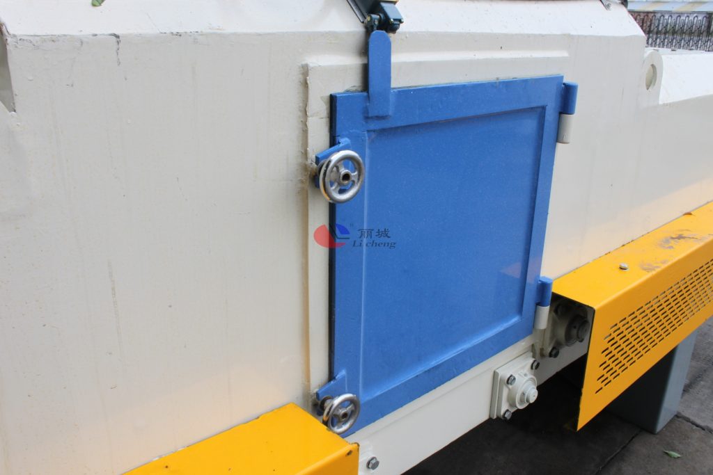 4.在將水泥地磚輸送至混凝土路面拋丸機內(nèi)部中后,通過使用步道磚模具澆筑成型的混凝土步道磚,受到來自空間結(jié)構(gòu)的不同方向的拋頭的密集強力彈丸的打擊與摩擦,使其其表面毛化,美飾。地面磚表面獲得一定的粗糙度的光潔表面,路面拋丸機在工作時,工作人員需要遠離室體進出口處,防止彈丸飛濺入眼,并需要進行掛牌警示。