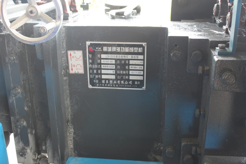這款LCK-25/30多功能側石二工位條紋成型機,其主要功能是對澆筑成型的水泥模具進行二次加工成型,其機器總功率為22.05KW,其傳送形式為調頻帶式步進,電源使用的標準為3N-50HZ 380V。